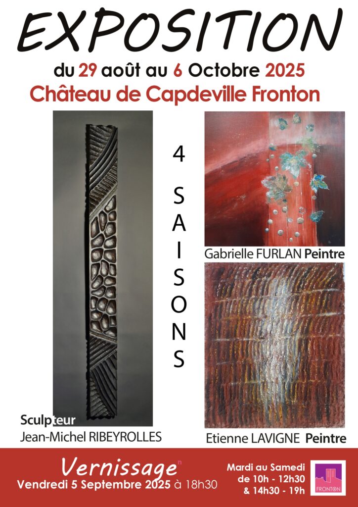 Toute l'année, la Ville de Fronton vous propose des expositions à la Maison des Vins et du Tourisme (Château de Capdeville). Peinture, sculpture, photos, une nouvelle exposition est à découvrir tous les mois. Du mardi au samedi de 10h à 12h30 et de 14h30 à 18h.